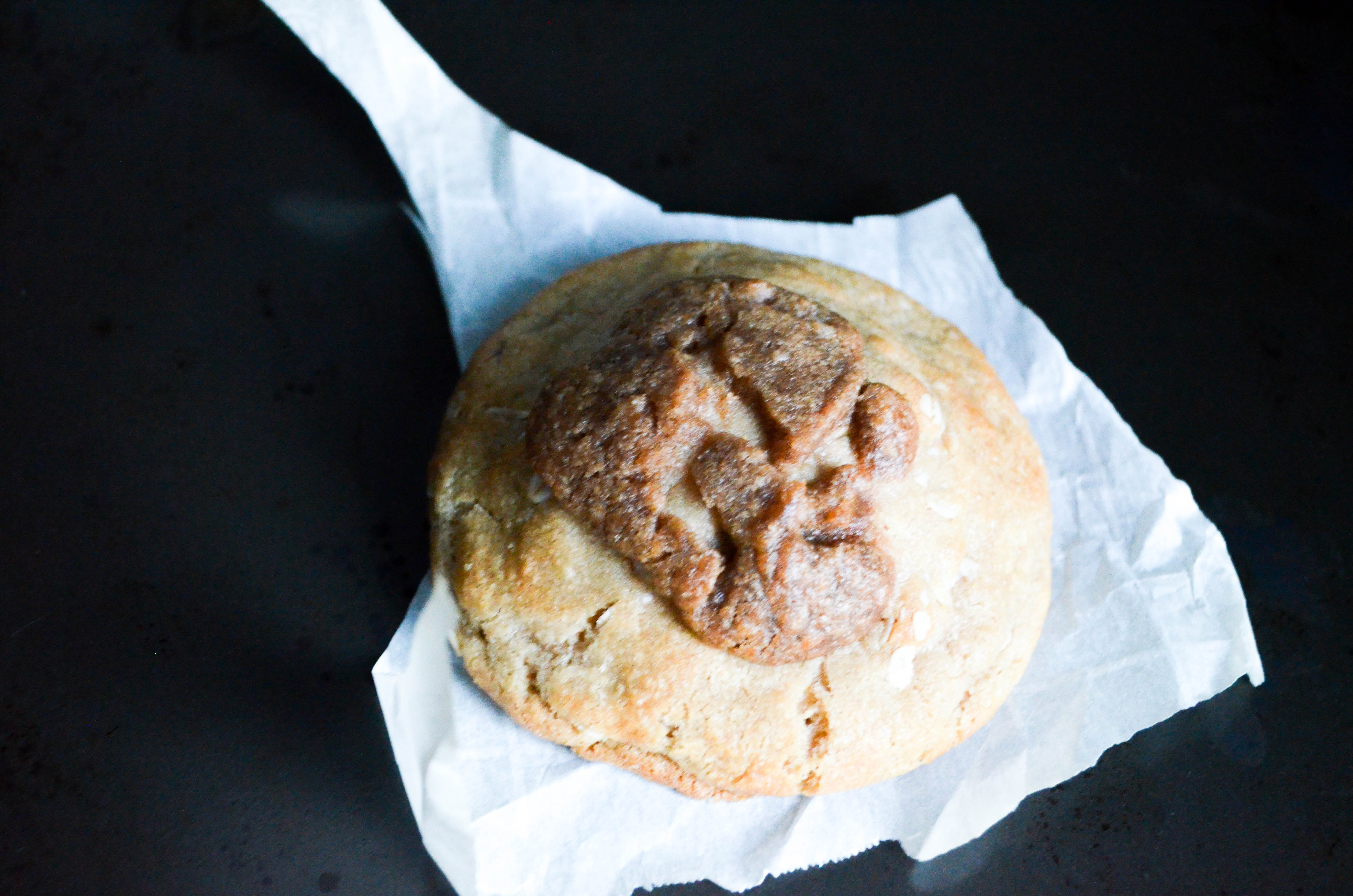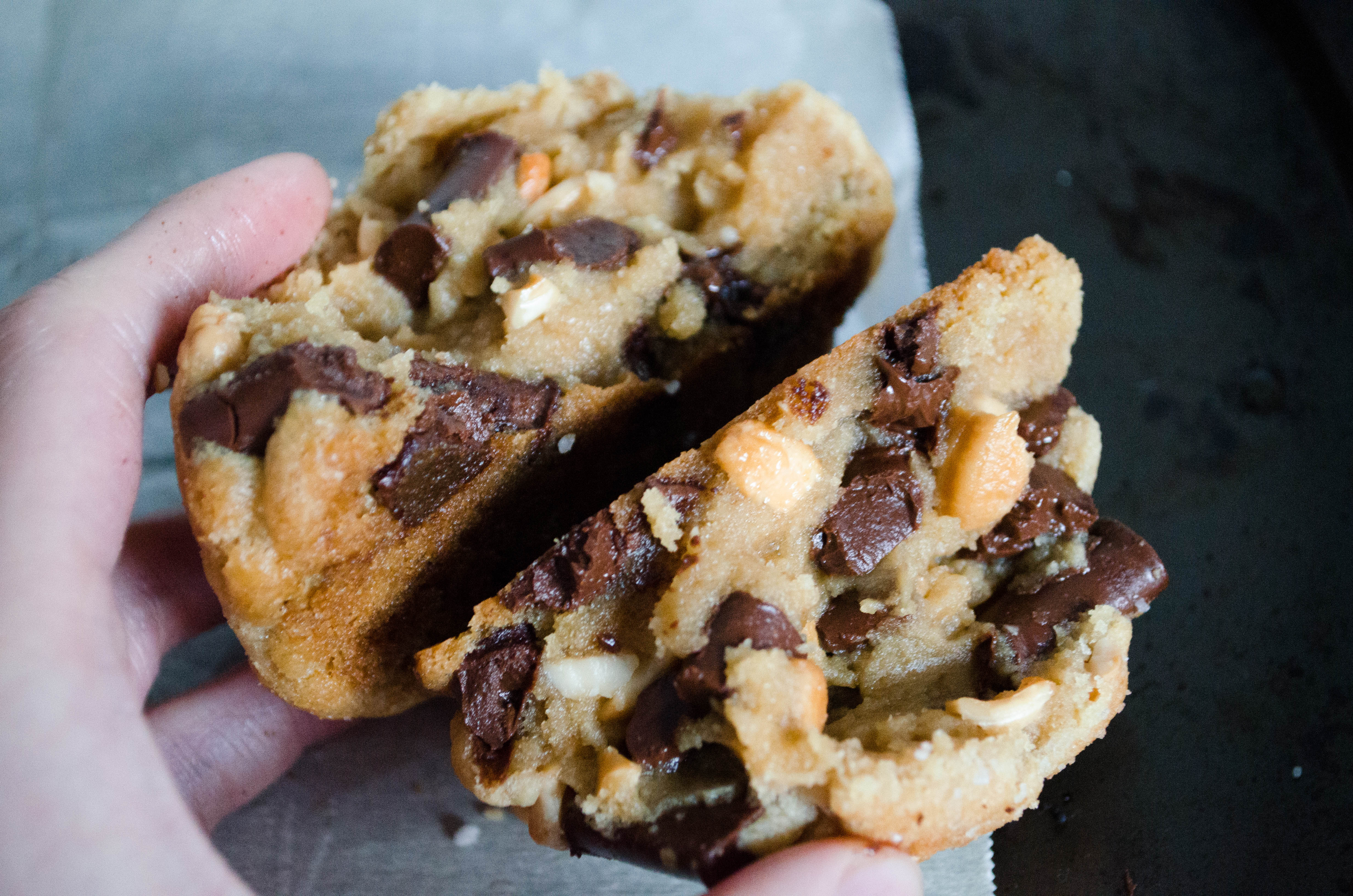 Description: The BIGGEST dark chocolate chip cookie with cashews finished with a sprinkle of sea salt. Warm, cozy, and eat-able at any time of the day.